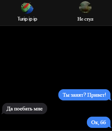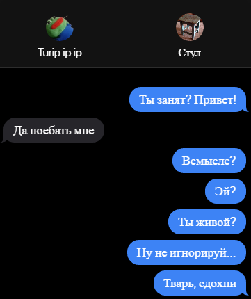 Обрати внимание, какой-то "Стул" продолжает написывать человеку, когда ему поебать. Его собеседник всё сделал верно, ведь ему поебать, а "Стул" продолжал написывать, а в конце даже пожелал ему сдохнуть. Не будь "Стулом", будь нормальным. Не нужно пытаться разговорить человека, если ему поебать, просто оставь его. А вдруг ему НАСТОЛЬКО поебать, что просто выключил устройство связи, а ты продолжил бы ему написывать.